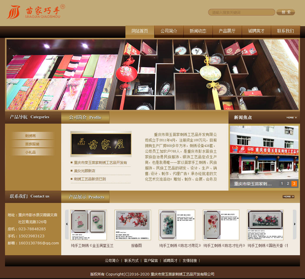 重慶市榮玉苗家刺繡工藝品開發(fā)有限公司成立于2011年4月,注冊(cè)資金100萬元,目前擁有生產(chǎn)廠房600多平方米,刺繡設(shè)備436套,公司員工加農(nóng)戶